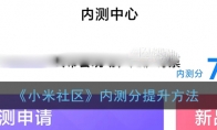小米社区上线了“内测分”,每个参与过的用户都会有一个初始的分数,可以在内测中心中查看到。据了解。这个内侧分的分数达到900或以上的,还能享受直接获得内测申请的资格,无需审核。那么小米社区怎么提高内测分呢?下面小编就来为大家介绍一下内测分的提升方法。>>小米社区内测分作用介绍 小米社区怎么提高内测分?1、补充用户社区基础信息(头像、昵称、个性签名等)2、在内测圈活跃,积极与其他用户互动,为其他用户解答问题3、在内测圈内发表的建议反馈帖被官方立项4、发表的内容帖被官方加精、推荐注:以上活跃行为仅在内测圈有效,若有恶意灌水、发表垃圾帖被官方下线等行为,会被扣除内测分。 内测分代表了用户在社区内测板块中的活跃和内测参与质量,内测分900及以上的用户在社区内申请内测可直接通过,部分有特殊要求的内测不在直接通