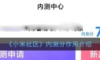 小米社区上线了一个内测分,应该有很多小米用户都看到了。在内测中心中,你就可以看到自己初始的内测分值,而当你的分值达到了900分后,就可以享受一些特权服务了。那么小米社区内测分具体有什么用呢?下面小编就来为大家介绍一下。>>小米社区内测分提升方法 小米社区内测分有什么用?内测分900及以上的用户可享受免申请直接通过内测审核 根据小米官方的介绍,小米社区内测分是根据用户在内测中的各种行为综合计算得出的一个分数,包含但不限于进入内测圈活跃互动、提出有效的内测建议反馈、生产优质内测帖等行为,未参与内测的用户内测分为0,从介绍看,还是有点官方的,但是说白了,就是要之前经常参与内测的米粉,内测得分就会高。 米粉申请MIUI12系统的稳定版、公测版、内测版的测试都是通过小米社区进行的,还有“超级壁纸”、“小爱同
