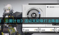 少前云图计划活动关初级怎么打?《少前:云图计划》游戏中活动关初级用什么阵容打比较好呢?今天小编就给大家介绍一下少前云图计划活动关初级打法阵容推荐,有需要的小伙伴不要错过了。《少前:云图计划》活动关初级打法阵容推荐首先是阵容,可以参考如图,协议我选的是五级(初始最高)注意下。并不是效能高就可以了,主要看阵容的搭配与理解,当然在最保证的情况下越高越好,哈哈哈。[嗒啦啦2_哈哈]首先说一下adc大招,就是。把场上所有的人集中在一个地区。可以配合武器强袭或者是苏尔的终极技能注意事项来了!这个关卡和其他关卡不同的就是每一关5个金币是可以买一个卡,如果需要扩容的话是必须要花金币升级的。而且每过一关敌人经验,就会加1。所以打这个活动关卡最重要的就是,前期的快速升级扩容卡和速通打法。这个就需要大家的计算。因为首先有些关打完以后