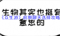 众生游聊天选择什么好?很多小伙伴不知道众生游聊天选择什么好。《众生游》是一款好玩又经典的游戏,玩家在游戏中可以开始重新规划和选择自己的人生,众生游黑白风格的游戏画面,不同的选择都会影响人生的结局。下面小编给大家带来《众生游》前期聊天选择攻略,希望能帮助到小伙伴们哦。《众生游》前期聊天选择攻略1、点击你身边的人物,就会有两个选项,聊天和请教聊天:可以暂时不在意每个选项下面的小符号,可以先随便选一个,然后关注聊天时的小火苗(如果对方感兴趣的话,会慢慢变大;如果对方特别喜欢的话,会增长的特别快;如果对方讨厌的话,会没有火苗)2、除了关注火苗,也可以关注你的人物说的话3、例如:他可能有点喜欢……他好像很喜欢…这样是可以聊下去的还有:他好像不想聊……这就可以换话题了4、一个话题聊的时间足够长的时候,会解锁对方是讨厌聊还是