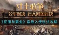 《征服与霸业》游戏中的蛮族入侵是一种不同的打法模式,小伙伴们知道蛮族入侵怎么玩吗?或许还有些小伙伴不知道,下面小编给大家带来征服与霸业蛮族入侵玩法攻略,感兴趣的小伙伴们一起来看看吧。>>>>《征服与霸业》最新礼包兑换码大全 《征服与霸业》蛮族入侵玩法攻略【规则解读】 首先必须注意:蛮族部队不会重复累积,而是会每天刷新,如果玩家前一日未登陆进游戏或参与剿灭蛮族,那么第二日蛮族部队的位置将再次更改。蛮族部队的等级与玩家的声望相挂钩,声望越高,满族等级越高。【战阵布置】 蛮族部队由三名敌将率领,从左到右部队的兵种分别是步、弓、骑,且部队每升5级都会增加400兵力。【剿灭步骤】 在作战之前,请玩家派出探子刺探蛮族部队的虚实和兵力情况,然后点击该部队所在格子选择剿灭,选择部队补充兵力。【奖励概览】