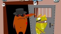《100种蠢蠢的死法》第六十四关玩法攻略,首先我们点一下钥匙就可以让绿食怪拿到,然后再插到钥匙孔里去,用两根手指向右边滑动屏幕。然后我们只要等到开门后黑社会大佬弄死他就行了。