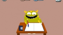 《100种蠢蠢的死法》第六十五关玩法攻略,大家在这一关需要绿食怪拿起笔然后在纸上滑动手指,它就会开始写字了,大家要坚持滑动一分钟左右然后停笔,然后书本会翻面,死神会出现在背后盯着绿食怪,结局你懂的。。。
