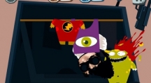 《100种蠢蠢的死法》第七十七关玩法攻略,这一关要我们千万别扮成恐怖分子,那么我们就一定要反着来!所以我们要把游戏中的这些道具装到绿食怪的身上,然后就顺利的弄死他了。