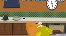 《100种蠢蠢的死法》第七十九关玩法攻略,这一关的死法非常搞笑。我们先打开烤炉放进火鸡,把炉门关上后调整时钟到十一点半前后,这时候绿食怪就会过去取火鸡,我们就在这个时候晃动手机,绿食怪摔倒后就会被火鸡蒙住头,直接闷死。。。