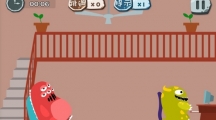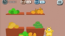 《100种蠢蠢的死法》第三十六关玩法攻略,这一关我们正确的过关姿势是把绿食怪放在水果摊中间,然后呢我们把手机逆时针转动九十度,很显然它就会被砸死了。