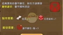 这次介绍的《迷你世界》春节窗花-福的图鉴,春节窗花系列是春节开放的,可以贴在方块侧面的让人观赏,不知道怎么合成获得春节窗花-福的小伙伴就来看看下面的解锁及合成方法吧。春节窗花-福 【合成需要】 纸张X1、红色染料X1【解锁需要】 春节窗花-福需要解锁。进入迷你世界,点击【我的家园】。 进入我的家园后,点击左下方的【图鉴】。 在图鉴的家具一栏里面,2017春节下可进行解锁。 解锁条件:春节窗花-福碎片*3。碎片可以通过春节福利活动获得或者270迷你豆解锁
