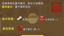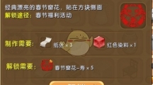 这次介绍的《迷你世界》春节窗花-寿的图鉴,窗花系列有着各种各样的剪纸印花,都非常好看和精致,不知道怎么合成获得春节窗花-寿的小伙伴就来看看下面的解锁及合成方法吧。春节窗花-寿 【合成需要】 纸张X3、红色染料X1【解锁需要】 春节窗花-寿需要解锁。进入迷你世界,点击【我的家园】。 进入我的家园后,点击左下方的【图鉴】。 在图鉴的家具一栏里面,2017春节下可进行解锁。 解锁条件:春节窗花-寿需要解锁碎片*5。碎片可以通过春节福利活动获得或者450迷你豆解锁