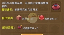 这次介绍的《迷你世界》红色陶花盆的图鉴,红色的小花盆,可以插上植物来做装饰,不知道怎么合成获得红色陶花盆就来看看下面的解锁及合成方法吧。红色陶花盆 【合成需要】 灰砂砖X2、红色染料X1【解锁需要】 红色陶花盆需要解锁进入迷你世界,点击【我的家园】。 进入我的家园后,点击左下方的【图鉴】。 在图鉴的家具一栏里面,2017春节下可进行解锁。 解锁条件:红色陶花盆碎片*2。碎片可以通过家园果实有几率开出或者180迷你豆解锁。