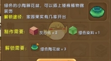 这次介绍的《迷你世界》绿色陶花盆的图鉴,绿色的小花盆,绿油油的配上红色的花花就很好看了,不知道怎么合成获得绿色陶花盆就来看看下面的解锁及合成方法吧。绿色陶花盆 【合成需要】 灰砂砖X2、绿色染料X1【解锁需要】 绿色陶花盆需要解锁进入迷你世界,点击【我的家园】。 进入我的家园后,点击左下方的【图鉴】。 在图鉴的家具一栏里面,2017春节下可进行解锁。 解锁条件:绿色陶花盆碎片*3。碎片可以通过家园果实有几率开出或者270迷你豆解锁。