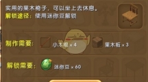 这次介绍的《迷你世界》果木椅子的图鉴,果木椅子是一个比较实用的道具,我们可以用来休息,不知道怎么合成获得果木椅子,就来看看下面的解锁及合成方法吧。果木椅子 【合成需要】 纸张X4、丝线X1、火药X2【解锁需要】 果木椅子需要解锁进入迷你世界,点击【我的家园】。 进入我的家园后,点击左下方的【图鉴】。 在图鉴的家具一栏里面,果木家具下可进行解锁。 解锁条件:大爆竹碎片*6。碎片可以通过家园果实有几率获得或者450迷你豆解锁。