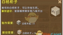 这次介绍《迷你世界》中的白杨柜子,也是由白杨做成的家具系列之一,柜子用来放东西还是很不错的哦,不知道怎么合成白杨柜子的小伙伴,就来看看下面关于白杨柜子的图鉴吧。白杨柜子 【合成需要】 白杨木板X8【解锁需要】 白杨柜子需要解锁进入迷你世界,点击【我的家园】。 进入我的家园后,点击左下方的【图鉴】。 在图鉴的家具一栏里面,白杨木家具下可进行解锁 解锁条件:白杨柜子*16。