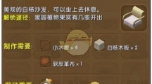 这次介绍《迷你世界》中的白杨沙发,洁白的白杨沙发看上非常舒服,而且合成也比较容易,不知道怎么合成白杨沙发的小伙伴,就来看看下面关于白杨沙发的图鉴吧。白杨沙发 【合成需要】 白杨木板*2+小木棍*4+软皮革布*1【解锁需要】 白杨沙发需要解锁进入迷你世界,点击【我的家园】。 进入我的家园后,点击左下方的【图鉴】。 在图鉴的家具一栏里面,白杨木家具下可进行解锁 解锁条件:白杨沙发碎片*20