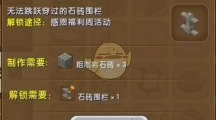 《迷你世界》在这次感恩福利周活动中推出了石砖围栏,石砖围栏用的材料也比较廉价的,石质的外观朴素好看,就来看看下面怎么样来解锁石砖围栏吧。石砖围栏 【合成需要】 粗制岩石砖X3【解锁需要】 石砖围栏需要解锁。进入迷你世界,点击【我的家园】。 进入我的家园后,点击左下方的【图鉴】。 在图鉴的建筑一栏里面,2017福利周(栅栏)栏下可进行解锁。 解锁条件:石砖围栏碎片*1。碎片可以通过参加2017感恩福利周活动获得。