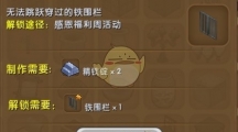 《迷你世界》在这次感恩福利周活动中推出了铁围栏,铁围栏用起来就非常结实了,无法跳跃通过的铁围栏用在农场养小动物,想要获得铁围栏的小伙伴就来看看怎么解锁铁围栏吧。铁围栏 【合成需要】 精铁锭X2【解锁需要】 铁围栏需要解锁。进入迷你世界,点击【我的家园】。 进入我的家园后,点击左下方的【图鉴】。 在图鉴的建筑一栏里面,2017福利周(栅栏)栏下可进行解锁。 解锁条件:铁围栏碎片*1。碎片可以通过参加2017感恩福利周活动获得。