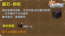 迷你世界基石-钢板在游戏中拥有比较重要的作用,因此每个玩家都想在游戏中获取到一些基石钢板,可是机身钢板的获取方法并不是那么的简单,下面小编就帮大家带来基石钢板的获取方法,想要了解的伙伴赶紧来看看吧!基石-钢板 【解锁需要】 基石-钢板需要解锁。进入迷你世界,点击【我的家园】。 进入我的家园后,点击左下方的【图鉴】。 在图鉴里面找到建筑一栏,就能找到基石-钢板。 基石-钢板解锁条件:钢板碎片*10。钢板碎片可以通过家园植物果实有几率出。消耗900迷你豆可解锁基石-钢板。可以在创造/玩法模式使用,生存模式下无法破坏。