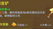 这次介绍《迷你世界》的闪金铲,在现实中金子虽然是金属但是作为工具制品并不出彩。但是!在《迷你世界》中金子不只是尊贵的象征,就是算变成了工具制品也有着惊人的效果,闪金铲就是挖掘工具中的豪杰。闪金铲 【合成需要】闪金锭*1、小木棍*3