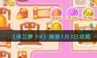 保卫萝卜4是一款国民休闲塔防游戏,我们可以每天参与周赛关卡,3月3日的周赛关卡怎么过?开局三级炮仗,一级火打钱袋升三,火升三防守,打荷花缸。下面是3DM小编给大家带来的《保卫萝卜4》周赛3月3日攻略,感兴趣的小伙伴们一起来看看吧。 《保卫萝卜4》周赛攻略大全2023年3月《保卫萝卜4》周赛3月3日攻略1、开局三级炮仗,一级火打钱袋升三,火升三防守,打荷花缸。2、打篮子买火打卷轴打大钟,打钱袋,打篮子买水,二级火单独清理左上角两个建筑。3、然后买火往左清理,三级火打石桌,买炮仗右清理。视频攻略:https://www.bilibili.com/video/BV1to4y1r7YR/?zw&spm_id_from=888.80996.embed_old 以上就是3DM小编整理带来的《保卫萝卜4》周赛3月3日