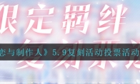 恋与制作人即将开启复刻活动投票。很多小伙伴都很想知道这个活动怎么样,今天小编给大家带来了《恋与制作人》5.9复刻活动投票活动介绍。感兴趣的小伙伴一起来看看把。 《恋与制作人》5.9复刻活动投票活动介绍复刻活动投票开启!活动时间:5月9日5:00~5月15日23:59 活动期间,完成每日任务可以获得【拾光车票】,可以为想要再次复刻的活动进行投票,本期备选活动为:【浓情满屋】2020年情人节SSR主题活动【兰夜绮景】2020年七夕SSR主题活动【心跳定律】2021年情人节ER主题活动活动结束后,票数最高的活动将在后续版本中再次开启复刻,详情敬请关注后续微博预告。 以上就是小编整理的关于《恋与制作人》5.9复刻活动投票活动介绍的全部内容,更多游戏攻略请持续关注3DM手游网!