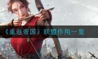 在《重返帝国》游戏中,联盟可以帮助玩家更快的发展,那么大家知道联盟的具体作用是什么吗?今天小编就给大家详细介绍一下联盟的作用,有需要的小伙伴不要错过了。 联盟作用一览1、“进入游戏首先要找个联盟加入,利用‘联盟帮助’减少建筑升级时间” 崔筱然(企鹅区领主)提醒联盟福利丰厚:除了互相助力升级建筑、发展城池外,盟友升级也能带来食物奖励。“联盟领地的每日签到宝箱记得去开。”亮仔(企鹅区领主)补充道,“帮助盟友获得的联盟币,还能兑换宝库物品”。 2、联盟的领地范围增加了普通迁城的可选区域,而领地内的名城要塞,也能提升资源产量。3、跟着联盟迁到富饶的领地,减少日常任务的行军时间的同时,也方便“多参加联盟城战”。浮生未歇(微信区领主)提醒:“打城奖励多多,除了升级技能的铜币奖励,首占城池还能获得帝国币”。 图:联盟占领渡