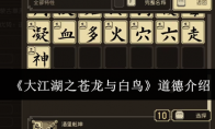 大江湖之苍龙与白鸟道德是什么?这是不少新手小伙伴们都很疑惑的事情了,实际上在游戏当中的道德属性,会直接影响到玩家的行为选择,本次小编就给大家专门解析一下道德数值供各位参考,希望这次的内容可以对大家有所帮助。《大江湖之苍龙与白鸟》道德介绍如果玩家想要提升自己的道德数值,在游戏内总共有三个选择,第一个是在进行角色创建时,就采用道德比较高的词条,例如义薄云天、得道者多助等等,这两个词条是完全随机的,而玩家想要走高道的路线,是一定要刷取出来的,高道德路线虽然会让玩家无法获取一些偷师的功法,但是由于道德水准比较高,玩家可以修炼高级的政教功法。第二个获取道德数值的方式就是,玩家完成游戏当中的特殊任务,例如玩家帮助贫穷的老妇人,治疗疾病,亦或是协助NPC完成搬运的任务,都能够小幅度地获取一到两点的道德数值。第三个获取道德的方