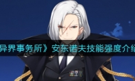 异界事务所安东诺夫怎么样?《异界事务所》游戏中很多玩家不了解安东诺夫的技能情况,那么今天小编就给大家介绍一下异界事务所安东诺夫技能强度,有需要的小伙伴不要错过了。 《异界事务所》安东诺夫技能强度介绍普通攻击:举起手枪,对前方单体目标造成伤害有效打击数:1LV2/3/4/5:普攻伤害+5%被动技:以其强大的气场,支配战局。初级后原地不动,包括自身所有友军攻击力提升10%LV2/3:所有友军攻击力+2%;LV4:所有友军攻击力+4%LV5:暴击伤害+20%特殊技:召唤精锐部队向前突袭,对前方造成范围伤害CD:40秒;有效打击数:4LV2/3:伤害+5%;LV4:伤害+15%LV5:冷却时间-10秒终极技:召唤具有原单位70%能力值的装甲部队,召唤单位的能力值随玛丽呀的等级提升CD:65秒;LV2/3:冷却时间-5秒