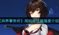 异界事务所周时雨怎么样?《异界事务所》游戏中周时雨的技能情况很多玩家还不了解,那么今天小编就给大家介绍一下异界事务所周时雨技能强度,有需要的小伙伴不要错过了。 《异界事务所》周时雨技能强度介绍普通攻击:挥动长刀,对前方敌人造成范围伤害。有效打击数:1LV2/3/4/5:普攻伤害+5%被动技:远距离攻击伤害减免+30%。每进行5次普攻后,进入反击姿态,收到普攻时进行反击,造成范围伤害。若未发动反击,则提升50%的回避率,持续8秒。有效打击数:2LV2/3:攻击力+3%;LV4:攻击力+6%LV5:反击伤害量+30%,未发动反击时额外提升30%的攻击速度特殊技:挥舞长刀,将周围敌人击飞后使用短剑进行切割,对敌人造成范围伤害。CD:22秒;有效打击数:3LV2/3:伤害+5%;LV4:伤害+15%LV5:有效打击次数