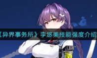 异界事务所李悠美怎么样?《异界事务所》游戏中李悠美的技能有很多玩家不清楚,那么今天小编就给大家介绍一下异界事务所李悠美技能强度,有需要的小伙伴不要错过了。 《异界事务所》李悠美技能强度介绍李悠美 普通攻击:使用能量环生成一把剑,对前方造成范围伤害有效打击数:2LV2/3/4/5:普攻伤害+5%被动技:充满自信,不顾一切地进行突击。出击后,回避率提升50%,持续20秒LV2/3:受到伤害-2%;LV4:受到伤害-4%LV5:受到伤害-15%特殊技:旋转自身接近目标并造成范围伤害。受到伤害的敌人命中率降低30%,并在5秒内强制攻击李悠美。CD:16秒;有效打击数:2LV2/3:冷却时间-1秒;LV4:冷却时间-2秒LV5:敌人攻击力-10%终极技:将剑一分为二,以恐怖的速度挥舞下劈,对周围造成范围伤害。施放技能后,