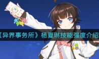异界事务所杨夏琳怎么样?《异界事务所》游戏中杨夏琳是个不错的角色,那么技能如何呢?今天小编就给大家介绍一下异界事务所杨夏琳技能强度,有需要的小伙伴不要错过了。 《异界事务所》杨夏琳技能强度介绍普通攻击:对远距离和空中单位进行机枪扫射造成伤害,持续5秒。对近距离单位使用剑击造成范围伤害。有效打击数:1LV2/3/4/5:普攻伤害+5%被动技:召唤令敌人士气低落的朋友,收到普攻的敌人攻击力降低10%,持续5秒。LV2/3:受到伤害-2%;LV4:受到伤害-4%LV5:敌人攻击速度-10%特殊技:召唤魔法熊使用辅助魔法,范围内所有友军获得一个相当于自身体力15%的护盾,持续10秒。同时技能充能速度提升20%CD:24秒;LV2/3:冷却时间-2秒;LV4:冷却时间-4秒LV5:技能充能速度提升变更为25%终极技:召唤