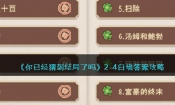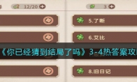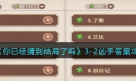 《你已经猜到结局了吗》是一款好玩的休闲养成解谜游戏,玩家将深入了解各种凶杀案,通过询问获得案件线索,成功找到真正的凶手。游戏中第四章第7关怎么过呢?下面小编给大家带来了《你已经猜到结局了吗》4-7路灯漓答案攻略介绍,一起看看吧!>>>>《你已经猜到结局了吗》攻略大全>>>>《你已经猜到结局了吗》礼包兑换码大全2022《你已经猜到结局了吗》4-7路灯答案攻略4-7路灯Q1.12小时后还有几盏灯亮着?0盏Q2.老罗为什么突然跪下?过于害怕Q3.小伙子是来做什么的?巡查暗访有天晚上,街道管理处来了个想要面试巡逻员的小伙子,处长老罗不喜欢这个小伙子,于是出了个有关于街道巡逻的数学题刁难这个小伙子。小伙子在听完题目之后只说了一个数字,老罗对这一答案感到非常不屑,但随后,老罗