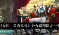崩坏星穹铁道砂金适配队友有哪些?崩坏星穹铁道砂金是游戏中一个五星虚数的角色,属于是生存位,能够为队伍中的成员增加护盾以及增益效果,也能够作为输出位进行攻击,接下来小编会为大家带来崩坏星穹铁道砂金适配队友一览。《崩坏:星穹铁道》砂金适配队友一览砂金适配队友:任何需要护盾型生存位的都可以适配砂金特别适配队友:托帕、真理医生、克拉拉、黄泉、彦卿常规配队公式:砂金+输出位+辅助位+辅助位一、砂金的定位1、本职工作:生存位,使用群体护盾,负责保障全队人员的生存能力,保证战斗结束之时全员存活。2、兼顾职责:辅助位,通过终结技等手段,为全队提供BUFF增益,提高队伍的伤害。3、兼顾职责:输出位,由于砂金的伤害是防御力倍率,所以同时可以提供额外的伤害补充。4、特别机制:与能够施放追加攻击的队友能够达成更优的配合。二、能与砂金适