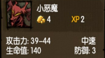 这次为大家带来的是《贪婪洞窟》里的小恶魔的图鉴介绍,小恶魔属于低级怪物当中较有威胁的,会对玩家造成明显的伤害,而且没有弱点属性,玩家在第一次遇见此怪物时可能会有麻烦,下面让我们一起来看看小恶魔的属性。小恶魔 金币奖励 4经验奖励 2攻击力 39-44攻击速度 中速生命值 140防御力 3元素属性攻击 暗11元素属性防御 暗6所在层数 1-10弱点 无