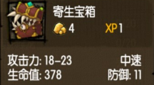 这次为大家带来的是《贪婪洞窟》里寄生宝箱的图鉴介绍,寄生宝箱就是我们通常所说的“宝箱怪”,伪装成宝箱的模样,等冒险者接近时,张开血盆大口将冒险者吃掉。贪婪洞窟里的宝箱怪却很实诚,直接张开大口就向你冲过来,让我们来看看它的具体属性。寄生宝箱 金币奖励 4经验奖励 1攻击力 18-23攻击速度 中速生命值 378防御力 11元素属性攻击 草6暗7元素属性防御 草4暗5所在层数 10-20弱点 无寄生宝箱是一个比较特别的怪物,不像别的怪物只出现在固定的几层,这个怪物从10+层之后都会出现,而且非常厉害,如果玩家不是刷怪的情况下,能不打这个还是别打。