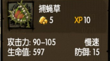 这次为大家带来的是《贪婪洞窟》里的捕蝇草的怪物图鉴介绍,捕蝇草取自现实中存在的同名植物,但游戏里捕蝇草可没那么温顺,长着一个布满獠牙的大嘴巴,感觉能吞下一头牛,干脆改名叫捕牛草算了。下面一起来看看它的属性。捕蝇草 金币奖励 5经验奖励 10攻击力 90-105攻击速度 慢速生命值 597防御力 15元素属性攻击 暗28元素属性防御 暗8所在层数 20-30弱点 火