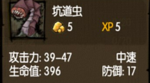 这次为大家带来的是《贪婪洞窟》里的坑道虫的怪物图鉴介绍,坑道的生命值和防御力都较低,属于20层到30层当中较为容易击杀的怪物,长的也是一副怪物当中的大众脸,在很多游戏中可以见到它相同外貌的怪物。坑道虫 金币奖励 5经验奖励 5攻击力 39-47攻击速度 中速生命值 396防御力 17元素属性攻击 草10元素属性防御 草9所在层数 20-30弱点 火