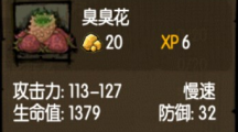 这次为大家带来的是《贪婪洞窟》里的臭臭花的怪物图鉴介绍,到了30-40层,怪物的属性又上了一个台阶,臭臭花是一只长的很像现实中的大王花的怪物,不同的是它中间的花蕊处长着布满荆棘的巨口,仿佛散发着恶臭,让我们来看看它的具体属性。臭臭花 金币奖励 20经验奖励 6攻击力 113-127攻击速度 慢速生命值 1379防御力 32元素属性攻击 水17草29暗21元素属性防御 水18草15暗15所在层数 30-40弱点 火