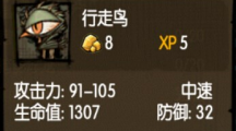 这次为大家带来的是《贪婪洞窟》里的行走鸟的怪物图鉴介绍。飞不起来,单纯靠走路的鸟,双腿已经进化的很健壮,所以踢人很疼,行走鸟是无属性的怪物,不带有任何元素属性,但它却被火属性克制,这个大家可以注意一下。行走鸟 金币奖励 8经验奖励 5攻击力 91-105攻击速度 中速生命值 1307防御力 32元素属性攻击 无元素属性防御 无所在层数 30-40弱点 火
