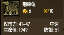 这次为大家带来的是《贪婪洞窟》里的荆棘龟的怪物图鉴介绍,荆棘龟,顾名思义,背壳上长满荆棘的乌龟,看着就很耐打。这个特点也体现在他的面板属性当中,攻击力偏低,但是血量和防御力都是很高的水准,下面我们一起来看看。荆棘龟 金币奖励 6经验奖励 10攻击力 41-47攻击速度 中速生命值 1949防御力 51元素属性攻击 水10草10元素属性防御 水16草15所在层数 30-40弱点 无