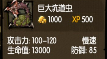 这次为大家带来的是《贪婪洞窟》里的巨大坑道虫的怪物图鉴介绍。巨大坑道虫,坑道虫放大版,身子下面还长着一个大肉球,形象怪异,作为第40层的boss,虽然没有元素攻击力,但是却血厚防高,十分耐打,各位玩家可能要陷入苦战了。巨大坑道虫 金币奖励 1000经验奖励 500攻击力 100-120攻击速度 慢速生命值 13000防御力 85元素属性攻击 无元素属性防御 水20草40光20所在层数 40弱点 无