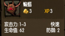 《贪婪洞窟》里的怪物各式各样,每一个怪物都有着特殊的属性,1-10层出现的蝙蝠是最弱的几种怪物之一,他的所有属性都偏低,玩家可以很轻松的击杀,相对的给予的经验也会非常的少,这里为大家带来的是蝙蝠的怪物图鉴。蝙蝠 金币奖励 3经验奖励 3攻击力 1-3攻击速度 快速生命值 62防御力 2元素属性攻击 草2暗2元素属性防御 草2暗3所在层数 1-10弱点 火