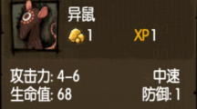这次为大家带来的是《贪婪洞窟》里的怪物异鼠的图鉴,异鼠是最基础的怪物,不管是血量还是攻击力防御力,都是最下级的水平,它是玩家一开始就可以遇到的怪物,可能也是所有怪物中被杀次数最多的怪物,下面我们一起来看看。异鼠 金币奖励 1经验奖励 1攻击力 4-6攻击速度 中速生命值 68防御力 1元素属性攻击 火3元素属性防御 火4所在层数 1-10弱点 无