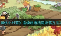 解忧小村落是一款模拟经营村庄的小游戏,玩家们可以打造自己的村落,游戏里面除了大型建筑外,部分小建筑需要建造很多个,这种建筑可以进行批量建造。那么解忧小村落怎么连续建造相同建筑呢?下面是3DM小编给大家带来的《解忧小村落》连续建造相同建筑方法攻略,感兴趣的小伙伴们一起来看看吧。《解忧小村落》连续建造相同建筑方法攻略1、建筑多个建筑时,需要确保临近的土地没有障碍物;2、在建造时点击批量建造,点击土地拖动就可以了;3、如果建筑期间有障碍物导致无法建筑时,连续建筑功能就会被取消。补充关于地图解锁问题:①解锁地图需要官府达到足够的官府等级及消耗对应的资源条件;②点击布局-最上方的地图名(如官府所在的地方叫春饶,点击春饶两个字)就能进入大地图,查看已解锁的区域。以上就是《解忧小村落》连续建造相同建筑方法攻略,更多精彩内容,