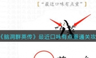 脑洞群英传是抖音上很有趣的小游戏,游戏中最近口味有点重怎么过?这是文字魔法关卡第4关,这一关通关方法是:1、“足”拖到菜字上方。2、“足”下拉3三次,“菜”变为“酸菜”。3、“酸菜"拖至“八”,游戏通关。接下来小编就给大家带来了《脑洞群英传》最近口味有点重通关攻略,一起来看看吧!>>>>《脑洞群英传》全关卡通关攻略抖音《脑洞群英传》最近口味有点重通关攻略关卡名称:文字魔法关卡等级:第四关,重口味关卡提示:最近口味有点重图文攻略:1、开局点击【趴】字中的偏旁【足】,将【足】字移动到【菜】的上方。2、然后将【足】字往下拉三次,【足】就会踩三下【菜】,脚上的脚气就会将【菜】变成【酸菜】。3、最后只要将重口味的【酸菜】移动到【趴】上,给趴着的人吃,就可以通关啦!这人口味真重。以上就是抖音小游戏《