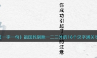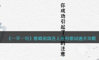 一字一句是抖音上非常受欢迎的文字解密游戏,游戏中歌唱祖国连上所有歌词怎么过?这一关我们需要连连看,接下来3DM小编就为大家带来了抖音小游戏《一字一句》祖国找到除一二三外的18个汉字通关攻略介绍,希望可以帮助到大家。>>>>>抖音《一字一句》游戏全关卡攻略大全 >>>>>相关推荐:抖音最近很火的文字游戏攻略大全 《一字一句》歌唱祖国连上所有歌词通关攻略歌唱祖国提示:连上所有歌词进入关卡我们看到都是歌唱祖国的歌曲,我们需要连连看 这个需要把整句歌词都连起来才算哦,比如咱当兵的人有啥不一样,答案如下图所示: I.我和我的祖国2.听吧新征程号角吹响3.红日日升在东方4.东方红太阳升5.唱支山歌给党听6.咱当兵的人有啥不一样7.团结就是力量8.我们都有一个家9