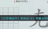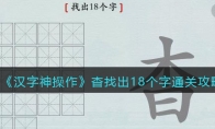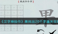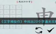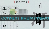 汉字神操作是一款抖音上很火的玩法简单的休闲猜字游戏,游戏中关卡涆找出20个字怎么过?这一关的涆字由三点水、日和干组成,是一个不常见的字,大家要找出其中隐藏汉字,下面是3DM小编给大家带来的《汉字神操作》涆找出20个字通关攻略,感兴趣的小伙伴们一起来看看吧。>>>>>小编推荐:《汉字神操作》全关卡通关攻略大全>>>>>相关推荐:抖音最近很火的文字游戏攻略大全《汉字神操作》涆找出20个字通关攻略1、涆找出20个字分别有:涆、干、旰(gàn)、一、口、汗、工、叿(hōng)、二、氵、汨(mì)、丄、匚、三、丶、汁、丅、凵、十、丨、叶、江、冂、日2、涆字左边是氵,中间是一个日,右边是一个干。日字中可以找出口、一、二、三,干字中可以找出十、丨、丄、丅、工3、三点