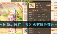 永恒岛之彩虹世界稀有属性效果是什么?稀有属性是《永恒岛之彩虹世界》游戏本次更新后加入的全新系统,大家可以看到新版本很多橙装都增加了一条额外的特殊效果,那就是稀有属性,很多小伙伴想知道这些稀有属性的效果是什么,下面就和小编一起来了解一下吧。 《永恒岛之彩虹世界》稀有属性效果一览:一、职业武器篇 1、战士 樱花枪攻击时一定概率触发固定增伤220点(3星)特别可怕的剑被击时一定概率触发物理免疫忍者双刀攻击时一定概率触发暴击伤害+350(1星)强盗摧山剑攻击时一定概率触发暴击伤害+120点龙神碧水剑攻击时一定概率触发固定增伤+260点爱心金刚击枪攻击时一定概率触发暴击伤害+3502、盾卫 幽灵狼亡灵剑攻击时一定概率触发无视物防+220(3星)沙漠暴风铁锤攻击时一定概率触发吸血+0.7%森林金刚芭比防护攻击时一定概率恢复