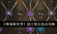 塔瑞斯世界战士铭石怎么加点?塔瑞斯世界是最近很受欢迎的开放世界手游,想必一定有很多玩家选择了战士这个职业,但是不知道战士的具体铭石加点。今天小编就给大家带了战士两条专精的铭石加点以及优先级,一起来看看吧。 《塔瑞斯世界》战士铭石加点攻略一、愤怒专精分支愤怒专精的铭石树加点推荐如下: 属性孔位优先级如下:连击>专注>全能=冷却>力量。 注:终结流派全能与冷却收益相差不大,怒刺流派冷却收益略高于全能。二、战盾专精分支战盾专精的铭石加点推荐如下: 属性孔位优先级如下:耐力=偏斜>全能>专注>冷却>力量。 注:选择2级专注1级全能会得到49.8的物理防御减伤与5.4的免伤,选择1级专注2级全能会得到,49.3的物理防御减伤与7.3的免伤。所以综合下来全能优先于专注。(大后期除