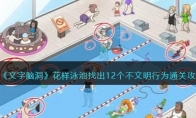 文字脑洞游戏是抖音上最近上线的文字脑洞闯关游戏,其中关卡花样泳池怎么过?这一关需要在图中找出12个不文明行为。下面是3DM小编给大家带来的抖音游戏《文字脑洞》花样泳池找出12个不文明行为通关攻略分享,感兴趣的小伙伴们一起来看看吧,希望对大家有帮助。