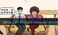 看你怎么秀小程序游戏是抖音上线的很火的休闲益智闯关游戏,其中关卡听妈妈的话这一关是帮儿子夺回40w,我们需要在房间里找到价值40w的东西。下面是3DM小编给大家带来的《看你怎么秀》听妈妈的话夺回40w财产通关攻略,感兴趣的小伙伴们一起来看看吧。