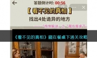 看不见的真相藏在餐桌下攻略来了!《看不见的真相》是一款很考验大家观察能力的益智类型的游戏,玩家们可在抖音内搜索【看不见的真相】点击打开小游戏游玩。其中关卡藏在餐桌下这关照片内容是家庭聚餐,玩家需要在照片中找出四处诡异的地方。下面是3DM小编给大家带来的《看不见的真相》藏在餐桌下通关攻略,不清楚如何过关的朋友一起来看看吧。 看不见的真相藏在餐桌下通关攻略1、本关卡的提示是:诡异的家庭晚餐,找出四处诡异的地方; 2、其中第一、二处都在餐桌下面,一个是小孩下面,一个是右边男子下面; 3、然后第三个是右侧柜子上可以透出一个人影,像在观察这一家人;4、最后第四处是左侧后面的人影,家庭晚餐中是没有这个人的,所以它是多出来的 以上就是3DM小编整理带来的看不见的真相藏在餐桌下怎么过关-藏在餐桌下通关攻略,更多精彩内容,请点